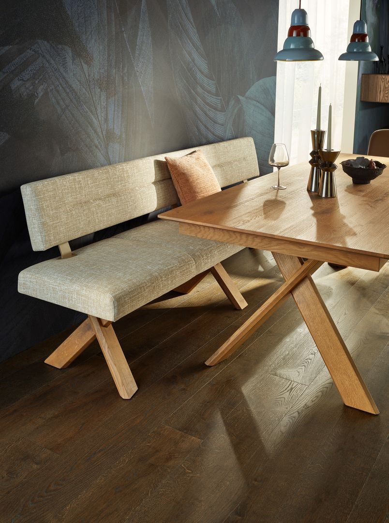 Das charakteristische X der Tischbeine trägt mehr als nur die massive Holzplatte – es trägt die ganze Eleganz einer reduzierten Formensprache. Feine Kanten, präzise Fügungen, handwerkliche Perfektion in jedem Detail. Das Holzgestell in X-Form ist das Fundament von Miro. Stabil, schön, zeitlos.
