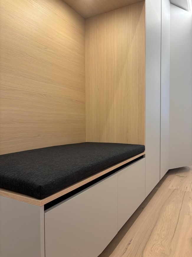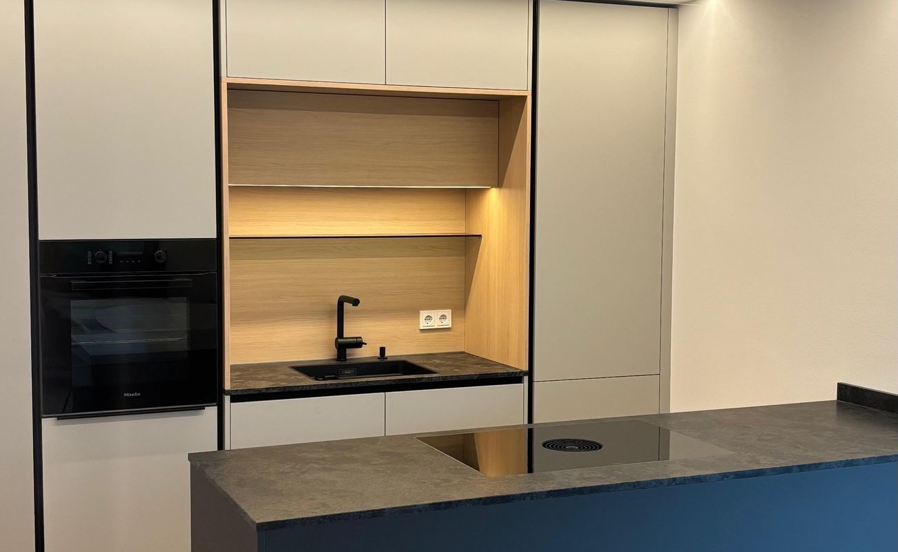 Die Küche überzeugt durch ihr elegantes Design, die schwarze Steinarbeitsplatte bildet einen eleganten Kontrast, während die Nischenrückwand in Holz dem Raum eine natürliche Note verleiht. Dezent, funktional und zeitlos.