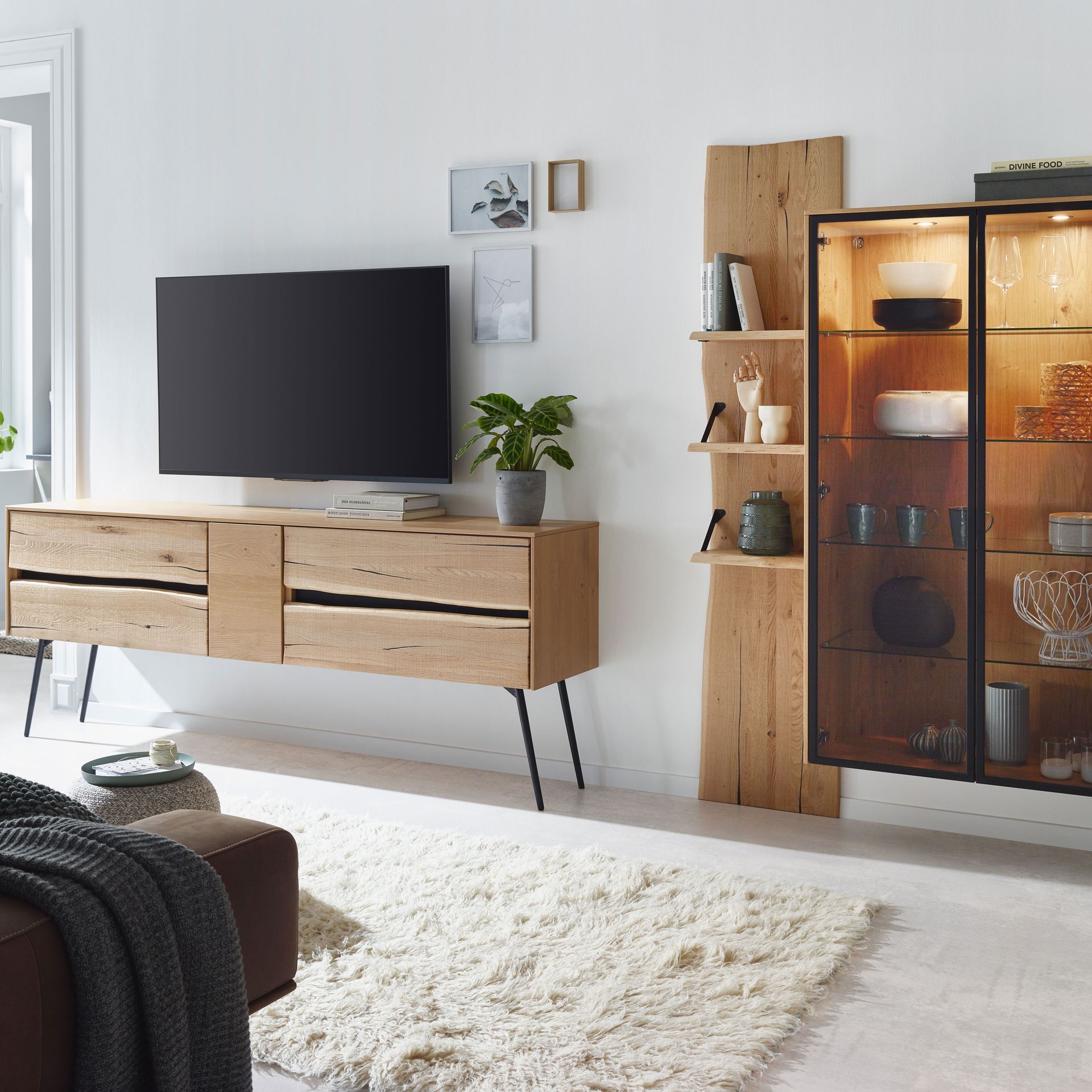 Im Wohnzimmer darf es auch ein bisschen mehr sein. Purismus ist das Eine, der topaktuelle Trend nach üppiger Deko das Andere. Es muss nicht immer schlicht sein und weniger ist auch nicht immer mehr. Deshalb halten auch wieder Samt, Seide und Brokat Einzug in unsere Wohnzimmer. Dazu gesellen sich warme Holztöne bei Regalen, Kommoden, Vitrinen und TV-Möbel.