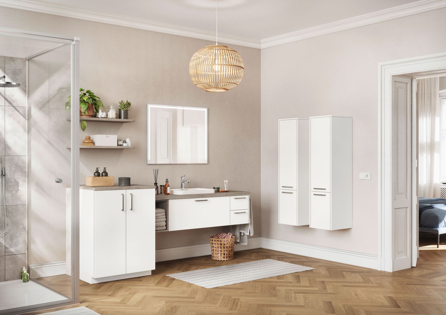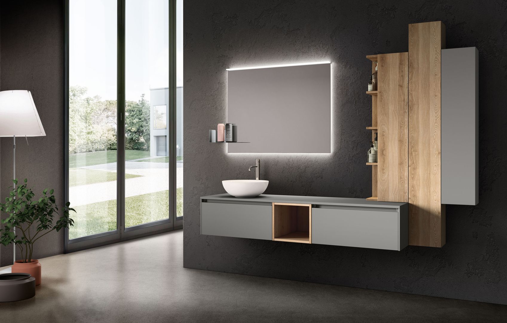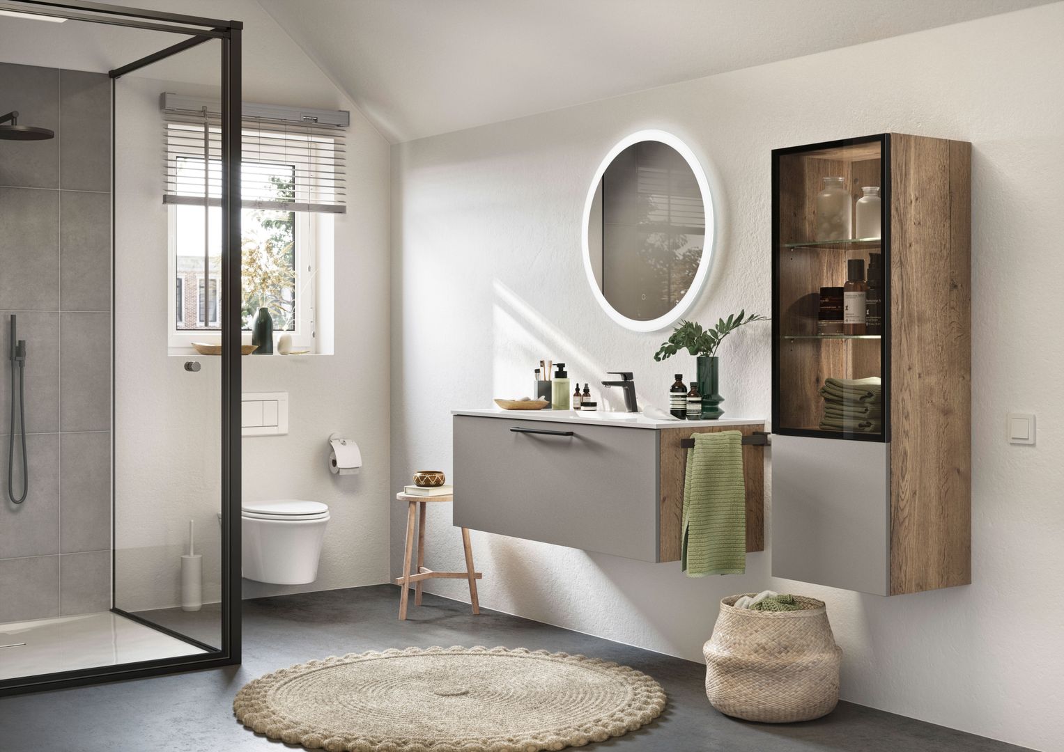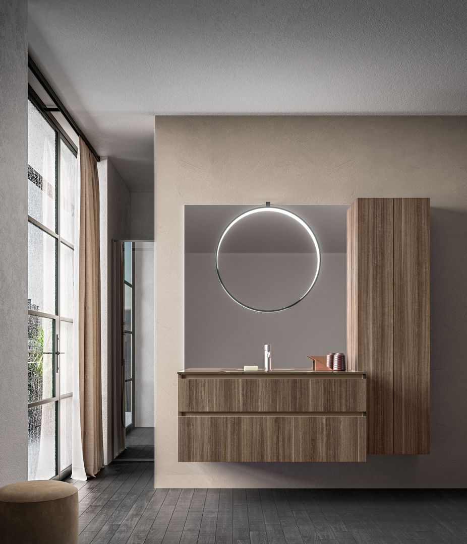 La luce del bagno dovrebbe possibilmente essere una luce gentile. Perché se lo specchio al mattino ci rimanda il nostro sguardo ancora mezzo assonnato, illuminando impietosamente fino all’ultimo dettaglio del viso, si vorrebbe subito tornare a spegnere la luce. Per un buon inizio della giornata è più conveniente quindi un’illuminazione equilibrata e d’atmosfera che oltretutto, ha anche il pregio di creare un ambiente accogliente e condizioni di luce ideali. Una lampada a parete supplementare o una luce dimmerabile integrata nella specchiera possono fare la differenza.