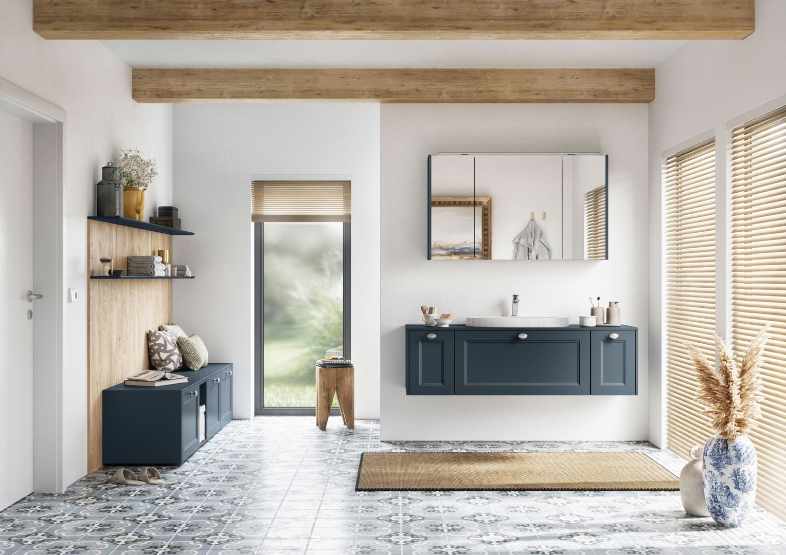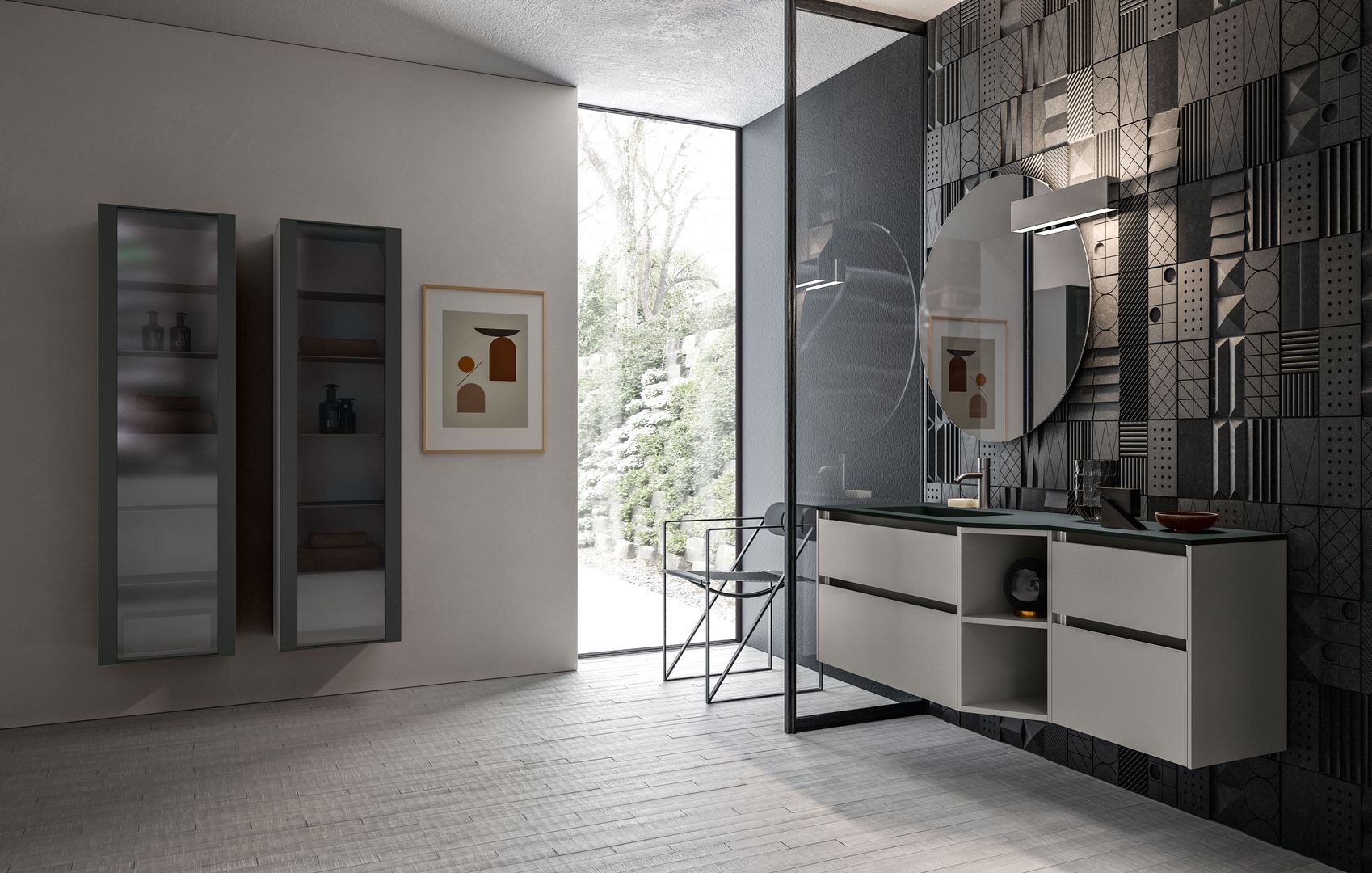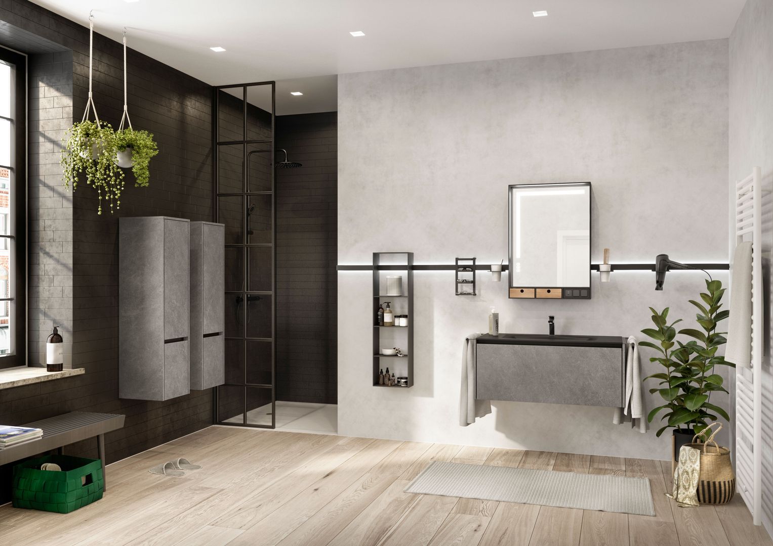 La luce del bagno dovrebbe possibilmente essere una luce gentile. Perché se lo specchio al mattino ci rimanda il nostro sguardo ancora mezzo assonnato, illuminando impietosamente fino all’ultimo dettaglio del viso, si vorrebbe subito tornare a spegnere la luce. Per un buon inizio della giornata è più conveniente quindi un’illuminazione equilibrata e d’atmosfera che oltretutto, ha anche il pregio di creare un ambiente accogliente e condizioni di luce ideali. Una lampada a parete supplementare o una luce dimmerabile integrata nella specchiera possono fare la differenza.
